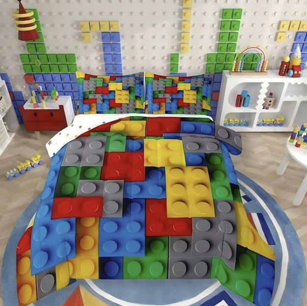 - Classic brick-patterned duvets (available on Amazon, Etsy, or LEGO’s official store).